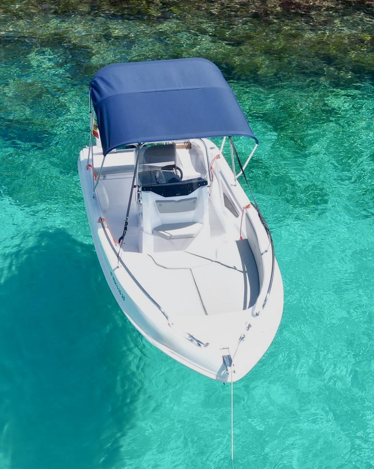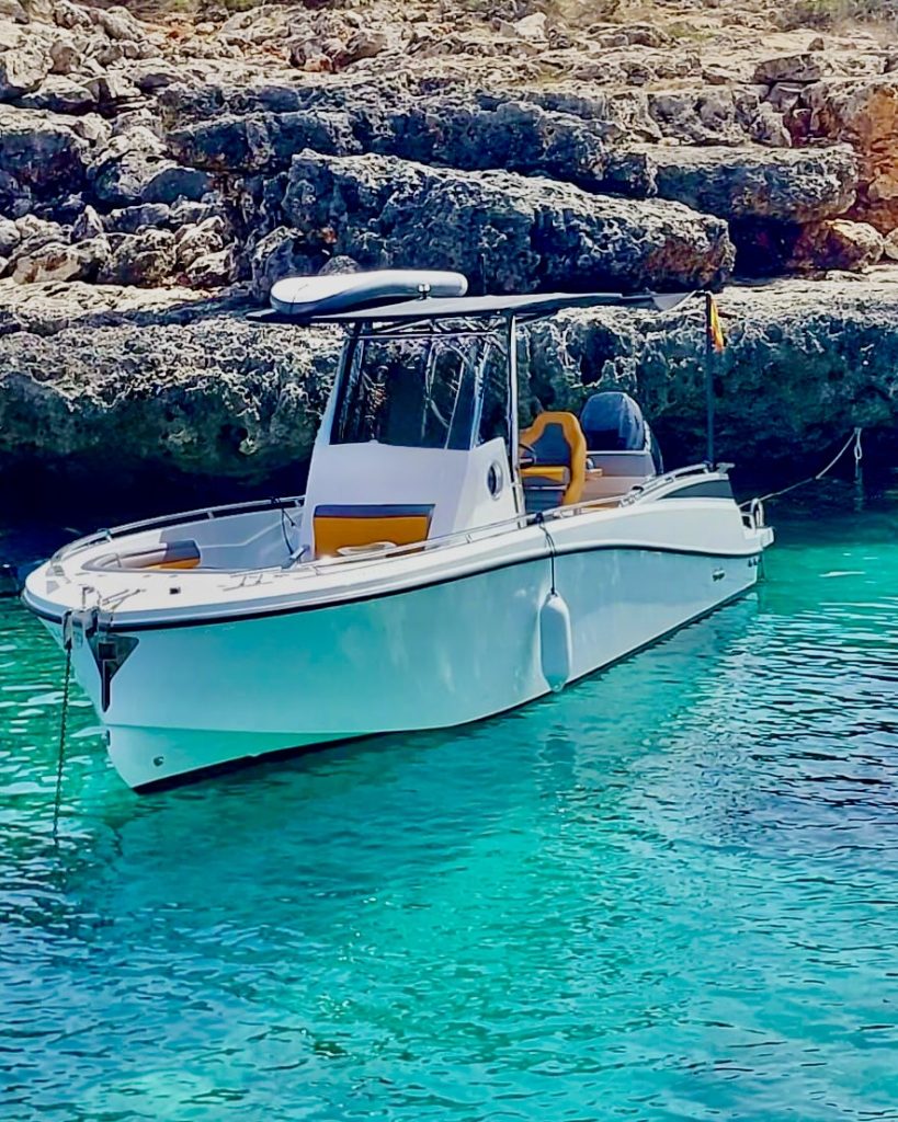 Excelente diseño italiano que combina elegancia y amplitud, dispone de gran solarium de proa, cómoda escalera de baño en popa, equipo de musica, gps, sonda. Barco muy amplio y cómodo para recorrer nuestras preciosas calas y pasar un dia inolvidable. Capacidad hasta 7 pasajeros. Disponible con o sin patrón. Base en Cala d´Or.