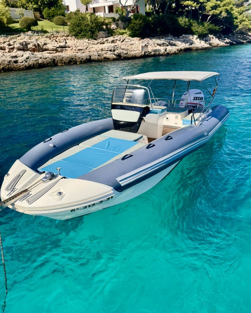 Excelente semirrígida con gran solarium en proa, molinete eléctrico de ancla, mesa y zona de comida en popa, ducha con agua dulce, música bluetooth, sonda, gps y un sinfín de extras. Capacidad hasta 12 pasajeros. Disponible con o sin patrón. Base en Cala d´Or.